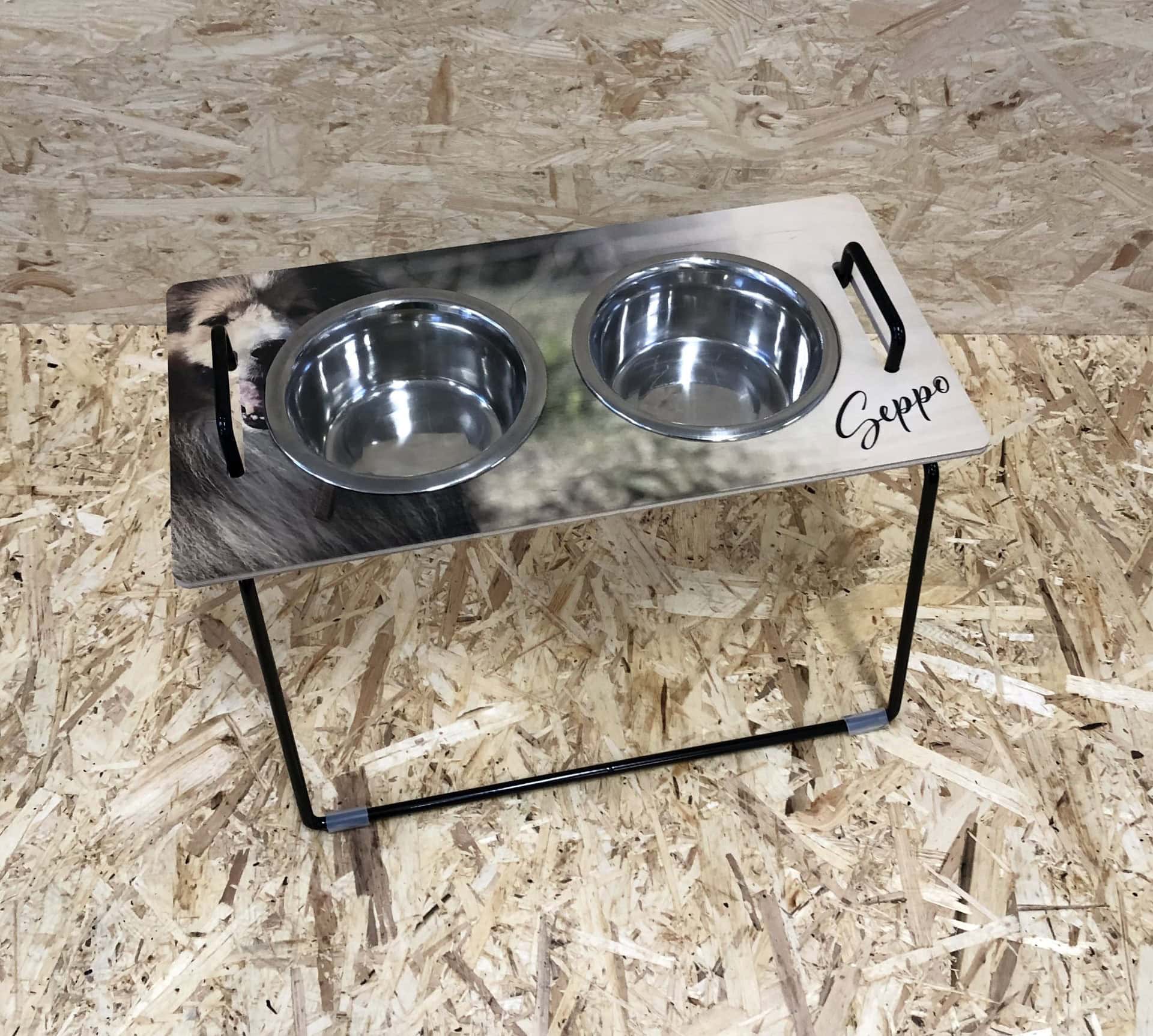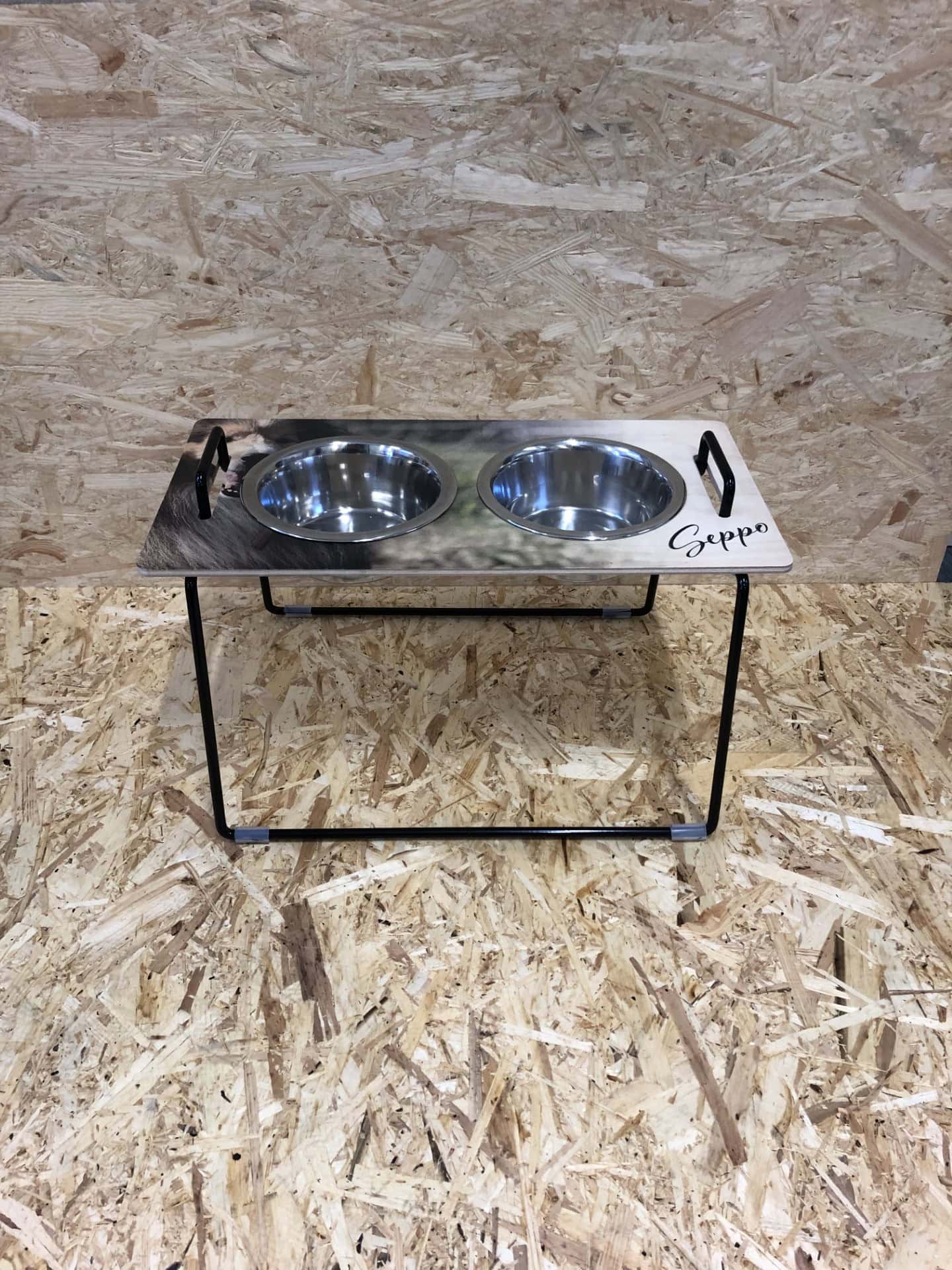 Tilaa yksilöllinen kuppiteline omalla kuvalla! Mökkimaisema, lemmikin kuva ja/tai nimi, taidekuva jne. Kuppitelineen korkeus 23cm ja se soveltuu yli 40 cm korkeille koirille. Puutaso on helppo puhdistaa, se kuivuu nopeasti ja pysyy kauniina pitkään. Tasoa voi käyttää molemminpuolin. Voit myös halutessasi käsitellä tason vahalla tai lakalla. Tee tilaus ja toimita meille korkealaatunen kuva sähköpotitse: sales@thinktoday.fi me lähetämme sinulle asettelun tasosta, kun hyväsksyt asettelun sähköpostitse meille valmistamme tuotteen ja toimitamme sen sinulle.